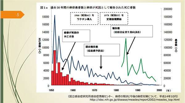 図1 過去50年間の麻疹患者数と麻疹が死因として報告された死亡者数