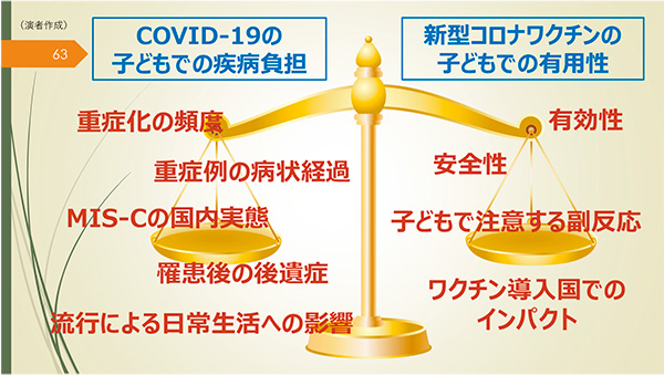 子どもへの接種にあたっては、接種抗原量や濃度が成人製剤とは異なるので、接種現場において間違わないように、事前の情報共有が不可欠です。また、課題としては、個別接種を基本とするのか、学校等の集団接種も行うのか、議論が必要です。さらに、副反応を疑う症状に対して、子どもに対応できる救急体制が夜間や休日を含めて必要となります。子どもへの接種については、感染による重症化の可能性が低い中で、ワクチンによるリスクを取る必要があるのか、といった議論もあります。感染のリスクとワクチンの有用性のバランス(図7)を考え、さらなる議論が必要です。