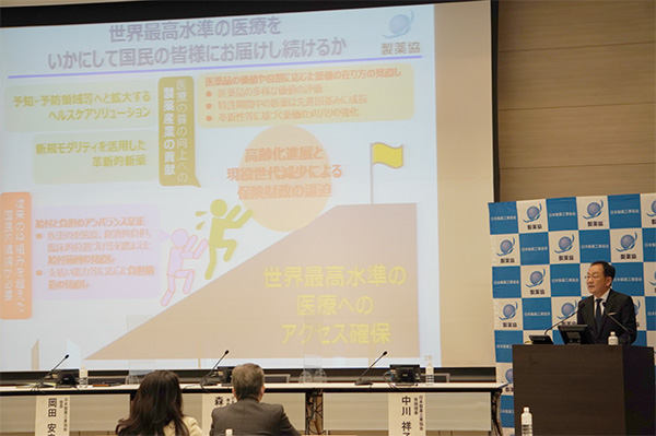 基本スタンスは、本日示した「国民の健康寿命の延伸を支え、日本経済を牽引し得る最先端の産業でありたい」である。さらに、日本経済の成長に寄与するエコシステムは、日本でイノベーションが生まれる基盤であり、エコシステム構築にしっかりと取り組まないと、「日本という国に未来はない」と考える。 最終的な薬価だけでなく、イノベーションを生むエコシステム、また、圧倒的な効率化につながる日本のデータを利活用できる環境を整備することが大きなポイントであり、これらが実現できた社会というのは、大きく様変わりしているはずである。製薬産業が中心となって、これらの議論をリードしていかなければならない、という気概をもっている。 |