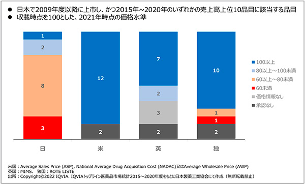 製薬協はさまざまな機会において、特許期間中における新薬の薬価維持を強く主張してきました。革新的新薬の価格、すなわち「新薬の価値」は、特許期間中において維持されるとのグローバルスタンダードな考え方に基づく主張です。2015年以降に、売上高上位10位に該当した品目について、代表的な先進創薬国であるドイツでは、10品目以上で100%、あるいはそれ以上の価格となっています。欧米では薬剤の価値が守られ、日本では引き下げられている実態が一目瞭然です(図1)。日本では薬価収載時に欧米と大きく乖離しない薬価が算定されたとしても、その後、特許期間中に薬価が引き下げられ、海外の価格との乖離が大きくなることがあり得ます。