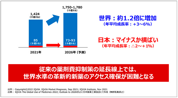 さて、今後5年間の市場予測についても少し触れたいと思います。IQVIAの予測では、世界市場は引き続き3~6%成長し、一方で日本市場はマイナスもしくは横ばいです(図2)。このような市場予測を現実のものとするわけにはいきません。従来の延長線上の薬価引き下げ策を継続することが限界を迎えていることを直視しなければいけません。