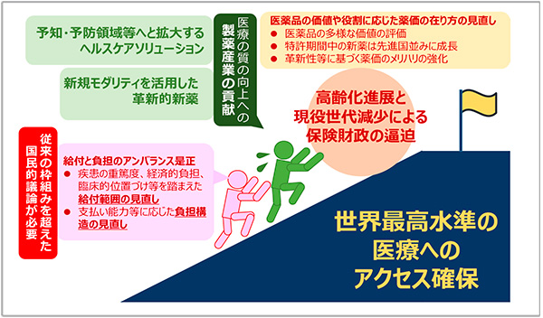 高齢化の進展等により、今後さらに保険財政が逼迫する中で、イノベーションと国民皆保険の両立を図るためには、これまでの枠組みを超えた議論が必要です(図3)。公的医療保険の給付範囲や、負担構造の見直しといった国民的な議論も不可欠になってきます。医薬品についても、画期的な治療効果をもたらす「新薬」から「上市以降に臨床的な位置付けが変化した薬剤」まで、すべてが公的医療保険でカバーされている現状を見直す必要も出てくると考えています。また、特許期間中の新薬、長期収載品、ジェネリックと大別すると、価格を構成する要素や役割が異なることは明らかです。その特性に合わせて、グローバルスタンダードの観点から、価格のあり方を議論することも必要と考えています。革新的新薬については、医療的な価値のみならず、労働生産性の改善等、多様な価値が評価されるべきであることは、昨今製薬協からも主張しています。一方で、新薬の中でも、さらに薬価のメリハリを強化するという議論があることも当然承知しています。