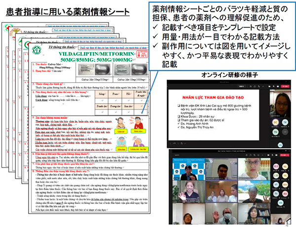 2年目から新たにプロジェクトに参画したフォノイ病院およびラオカイ病院はバックマイ病院と協力しながら、糖尿病薬剤情報資材のひな型(記載ルールを含めたテンプレート)を作成し、さらに処方の多い薬剤については、情報提供シートおよび動画等の服薬支援ツールを作成しました。当初予定していた訪日研修・訪越研修はすべてオンラインで実施し、資材作成にあたってはフォローアップ会議を3回実施することにより、服薬支援ツールの作成をきめ細かく支援しました。研修生の臨床薬剤師は、作成した服薬支援ツールを用いて患者服薬指導を実施し、患者さんからは服薬支援ツールに対して「とても役に立つ」等の高い評価をもらいました。