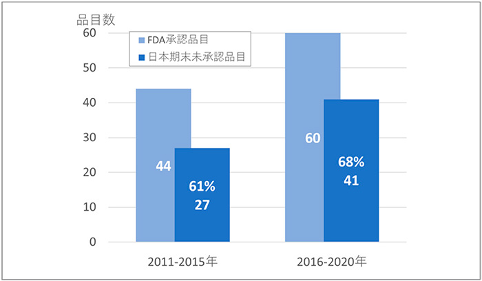 調査期間中に、FDAで承認された抗悪性腫瘍剤は、それぞれ前期44品目、後期60品目ありました。そのうち、日本未承認薬はそれぞれ前期27品および後期41品あり、日本未承認薬比率は61%から68%に増加していました(図1)。抗悪性腫瘍剤においても、先の報告※1と同様に増加したことが確認されました。