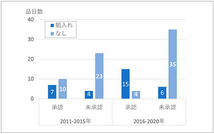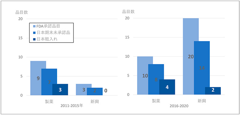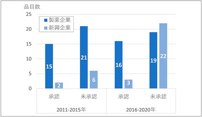 図2では、FDAへの申請者を新興企業もしくは製薬企業に分類して未承認薬数の変化を示しています。新興企業の品目では、承認薬は2品目から3品目に微増でしたが、日本未承認薬は6品目から22品目に顕著に増加していました。製薬企業の品目では、承認薬および未承認薬ともに前期と後期に品目数の大きな変化は見られておらず、日本未承認薬の増加は、新興企業品目の増加であることがわかりました。