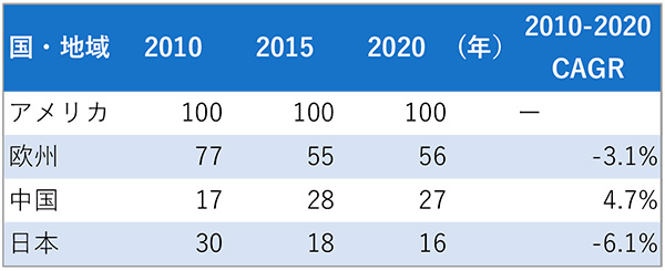 注:市場規模は、米国販売額を100とした場合の各国・地域の販売額を指数化した。