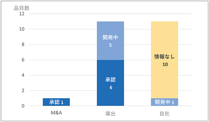 抗悪性腫瘍剤の33品目(29社)についてビジネス形態ごとに開発状況を見ますと、M&Aの11品目(9社)については、日本企業1社を含む、いわゆるグローバル製薬企業によりFDA承認の1~2年後に買収され、国内開発状況は承認(8品目)あるいは開発中(3品目)でした。導出の9品目はグローバルあるいは日本テリトリーにおいてFDA承認の1~2年後に主に日本の製薬企業に導出され、承認(4品目)あるいは開発中(5品目)でした。M&Aの形態に比べると承認に至っている割合は低いようでした。自社の13品目では、複数製品をもつ新興企業では日本法人を設立し、承認2品目あるいは開発中2品目と国内開発が進められていました。しかし多くの品目は、情報無し(9品目)と、2022年4月末時点で開発されている様子は確認できませんでした。なお、情報無しは調査したデータベースに記載がないことに加え、国内臨床試験を実施した経緯はあるが続報がない、あるいは中止の品目を含むため、医薬品の科学的な有用性が検証されなかった可能性も推察されました。