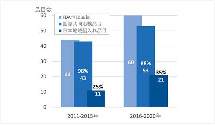 注:2ヵ国以上を組み入れている試験を国際共同臨床試験とした。複数の試験がある場合は後期臨床相を集計した