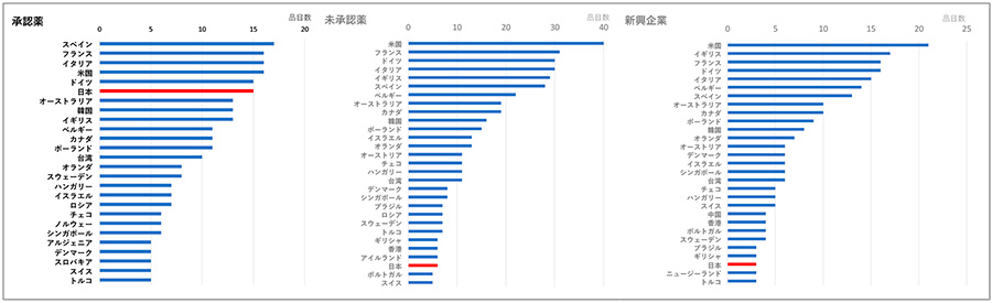 抗悪性腫瘍剤のほとんどの品目では国際共同治験を実施していましたが、日本地域の組入れ優先度が低いようでした。人口は少なく、医薬品市場も小さい韓国、台湾、香港、シンガポール等のアジア諸国が多く組み入れられていたことから、患者登録数・登録速度、試験開始にあたっての手続きの煩雑さ(日本語書類の整備を含め)、臨床試験の費用等に臨床試験環境の面で日本地域を選びにくい可能性が考えられました。また、国際共同治験に日本が組み入れられる際には、薬事規制上、日本人での忍容性評価等の追加的な臨床試験を事前に行う必要があり、組入れのハードルになっている可能性があります。新興企業から見た日本地域における薬事・臨床試験にかかわる課題については、より深い精査が必要と思われます。
