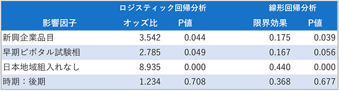 104品目のデータを用いたロジスティック回帰分析では、「新興企業品目」「早期ピボタル試験相」「日本地域組入れ無し」、と3つの影響因子において統計学的な有意差が認められました。日本地域を組み入れない場合は組み入れる場合に比べて、未承認薬となるオッズ比が8.9倍と推定され、影響が大きいことが示されました。また、最小二乗法を用いた線形確率モデルによる推定においても、いずれも統計学的な有意性が認められました。日本地域を組み入れない場合は組み入れる場合に比べて、未承認薬になる確率が44%高いことがわかり、新興企業品目や早期のピボタル試験相ではそれぞれ18%および17%であったことから、日本地域の組入れ無しは、評価した3つの因子の中では未承認薬となる確率が最も高いことが示されました。以上の統計解析結果から、未承認薬増加の要因として、ピボタル試験へ日本組入れがないことの影響が大きく、次いで新興企業、早期臨床試験相であることがわかりました。
