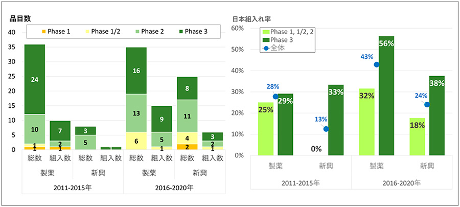 前期から後期にかけて、ピボタル試験への日本組入れ率は増加していたものの、新興企業の品目および早期臨床試験相で日本地域の組入れ率が後期で低いことが明らかとなりました。