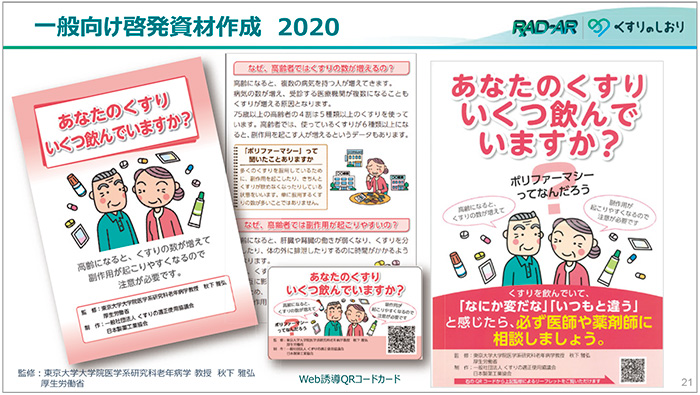 厚生労働省は、2017年に高齢者医薬品適正使用検討会を設置し、診療・処方の際の基本的留意事項をまとめた「高齢者の医薬品適正使用の指針(総論編)」を2018年に公表しました。また、高齢患者さんの医療環境ごとの留意事項をまとめた「高齢者の医薬品適正使用の指針(各論編(療養環境別))」を2019年に公表しています。これらの指針は、医師、歯科医師、薬剤師を対象としてまとめられたものですが、同検討会においては、患者さんや国民へのポリファーマシーに係る啓発の重要性についても指摘しています。この指摘を受けた形で、くすりの適正使用協議会と製薬協は、一般向け資材(リーフレット、QRコード付きカード、ポスター)を2020年に作成しました(図4)。これらの資材を薬局等の窓口への配架や、各種イベントでの配布等で積極的に活用いただけるよう、関係団体(公益社団法人日本薬剤師会、一般社団法人日本病院薬剤師会、一般社団法人日本保険薬局協会、一般社団法人日本チェーンドラッグストア協会)とも連携のうえ、広く国民への普及啓発に努めています。