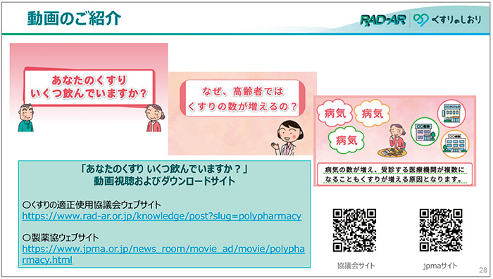 なお、2022年は、ポリファーマシーのさらなる啓発につなげることを目的とし、啓発冊子の内容をわかりやすく表現した動画版を新たに制作し、くすりの適正使用協議会と製薬協のウェブサイト上で公開していることの紹介がありました(図5)。また、当日は動画版の上映も行われました。