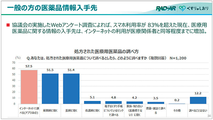 くすりの適正使用協議会が実施したアンケートによると、処方された医療用医薬品に関する情報の調べ方は、57.5%が「インターネットで調べる」という結果となりました。インターネットの利用が「薬剤師に聞く」「医師に聞く」といった医療関係者を通じた情報入手と、同程度までに増加しています(図6)。