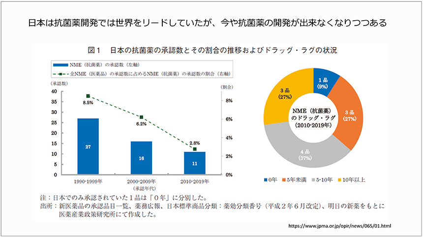 さらに、日本では、AMRと戦うための新規抗菌薬の承認数が減少傾向にあること、世界的に承認・使用されている抗菌薬が日本では承認されていない、いわゆるドラッグ・ラグが生じており、将来のAMR感染症治療における懸念が示されました(図3)。
