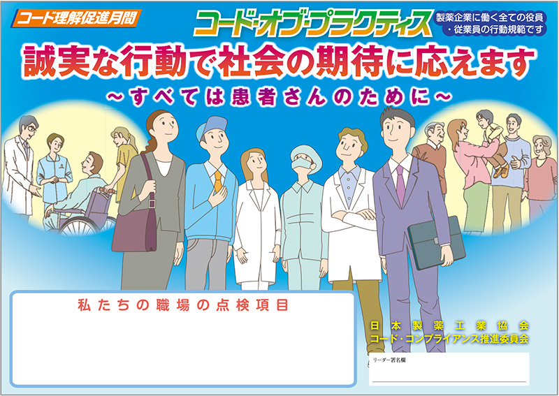 製薬協は、11月を製薬協コード・オブ・プラクティス(以下、製薬協コード)の理解促進月間として毎年取り組んでいます。2023年度のテーマは、2021年、2022年に引き続き「誠実な行動で社会の期待に応えます」です。 われわれが行うさまざまな企業活動の先には、患者さんや健康を願う人々がいることを念頭にサブタイトルを「すべては患者さんのために」と設定しました。改めて会員会社が一体となって、製薬協コードならびに自社コードの遵守徹底のため、社内点検を実施します。