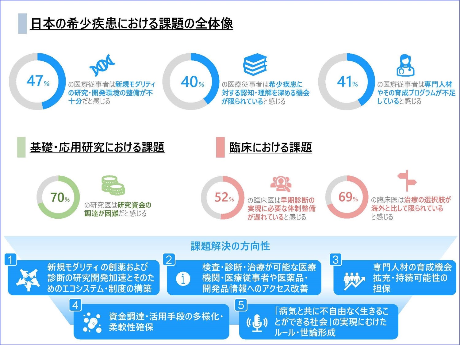 本調査は、定量調査(調査1)と定性調査(調査2)から構成されており、医療従事者の目線から、希少疾患に関する5領域(1.基礎・応用研究、2.開発・治験、3.診断、4.治療・予後管理、5.疾患啓発)における課題を抽出するとともに、それら課題に対する各ステークホルダー(製薬業界・学会・患者団体・行政)への期待や課題解決の方向性について取りまとめました。
