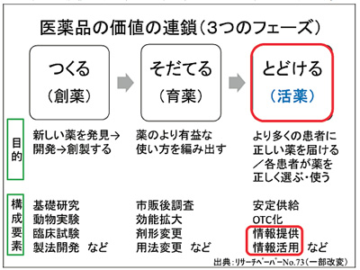 筆者は2019年5月に公表した政策研リサーチペーパーNo.73『「医薬品の価値」をあらためて考える』のなかで、医薬品の"価値の連鎖"として「価値をつくる(創薬)」→「価値をそだてる(育薬)」→「価値をとどける/いかす(活薬)」の3つの段階を考え、「活薬」=創製された医薬品の価値を適切にお届けし適切に使用していただくことにより医薬品の効能・効果を正しく発揮させることの結果として、その価値が顕在化され最大化されると表現した(下図)。