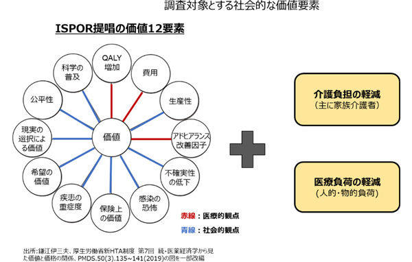 なお、本調査における社会的な価値要素については、ISPORレポートで提唱された価値12要素の中の社会的観点の9要素をベースとしつつ、英国NICEの評価事例および新型コロナウイルス感染症を契機とした英国やカナダの評価機関の動向を踏まえ、「介護負担の軽減(主に家族介護者)」、「医療負荷の軽減(人的・物的負荷)」も重要な要素と考え、これらの2要素も検討対象に加えることとした(下図)。