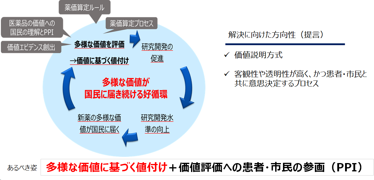 国民にとって納得性の高い薬価及び薬価制度とはどのようなものか。医薬品の多様な価値の評価により価値に基づく値付けがなされる。そして、研究開発が促進しその水準がさらに高まることでより幅広い価値エビデンスが創出される。創出された多様な価値が国民に届き続ける好循環となることこそ、本来国民に納得をもたらすものである。