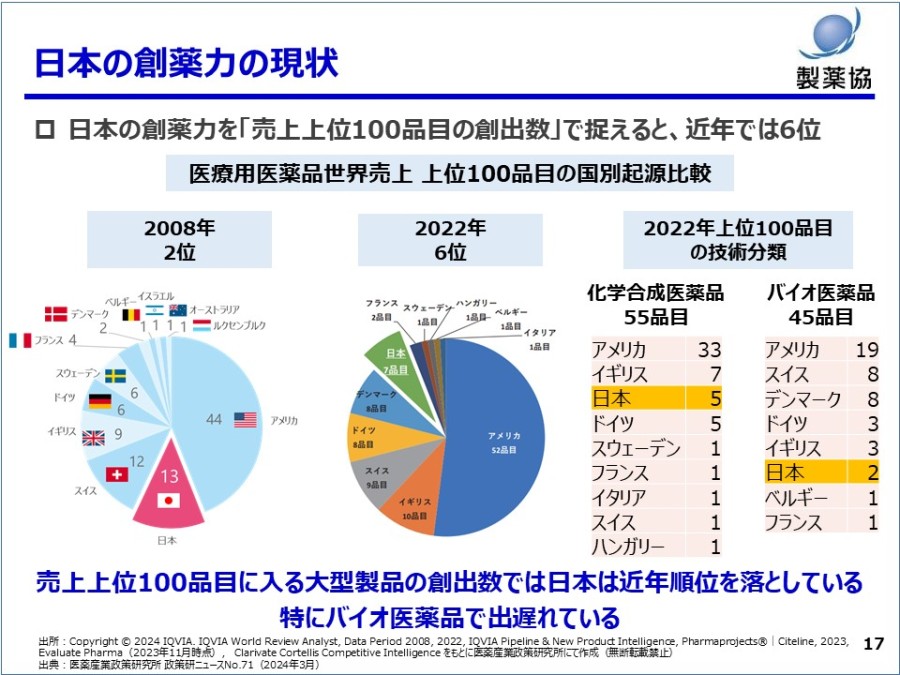 ここから数枚のスライドを使い日本の創薬の現状についての認識をお話しします。日本の創薬力を「世界売上上位100品目の創出数」で見た場合、2008年に世界第2位でありましたが、2022年には第6位と順位を落としています。これは特に、モダリティ別に見た場合、化学合成医薬品は第2位であるものの、バイオ医薬品の第6位が影響しています。一方、「グローバル承認品目の創出数」で見た場合には、2013年から2021年の累計となりますが、世界第1位の米国に続いて日本は33.5品目創出の世界第2位につけています(注:出願人として複数の機関が記されている場合、国籍別に均等割している)。如何に新薬を創出するかの点で考えれば、日本は依然として新薬を創出する力は高いレベルを維持しているといえます。そのため、日本に力がある間に、さらなる創薬力強化を図る必要があると考えています。