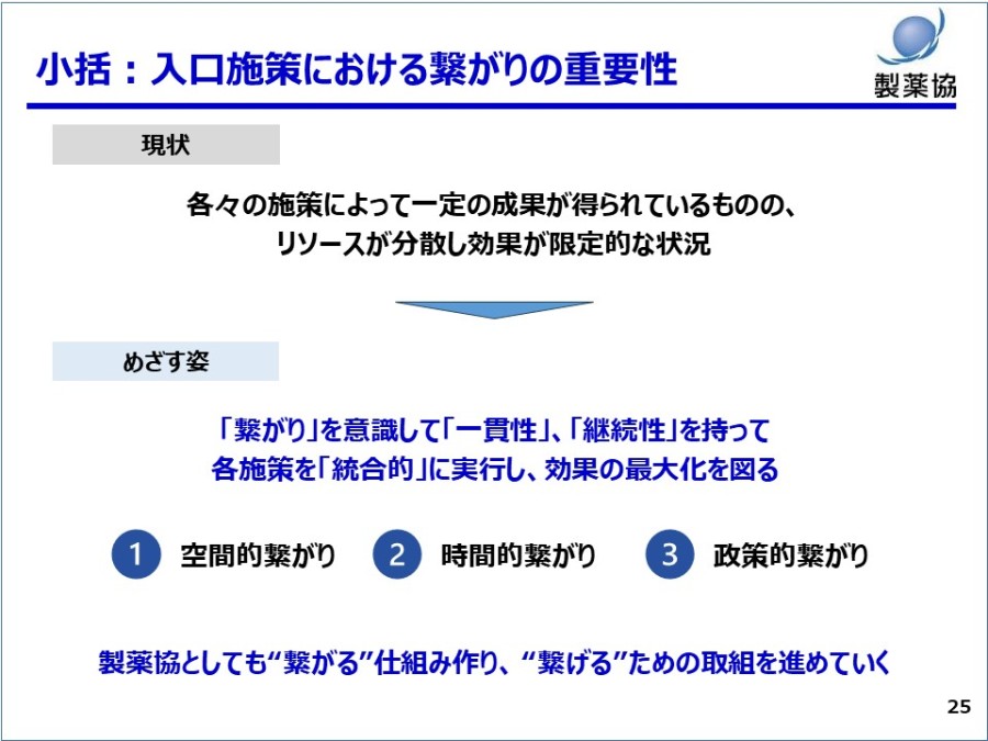 入口施策においては、空間的な繋がり、時間的な繋がり、そして政策的な繋がりが重要です。これらの3つの“繋がり”を十分意識した上で、一貫性、継続性をもって統合的に実行することが必要です。そして、この“繋がる”ための取組み、“繋がる”仕組みづくりに、製薬協としても協力していきたいと考えています。(図5)